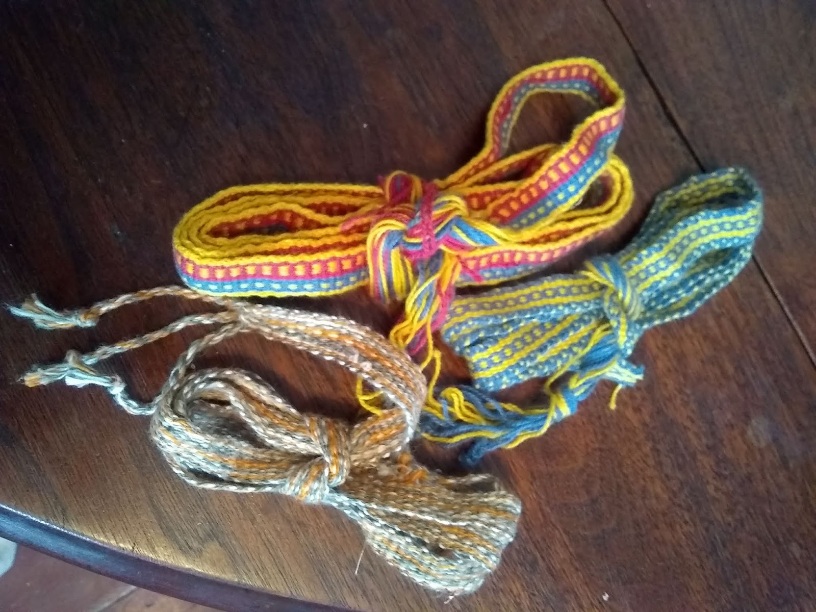 I have bundles of simple bands that I weave at events. I bring along my box looms and one of my granddaughters demonstrates how simple weaving on a band loom is and encourages visitors to try it out.